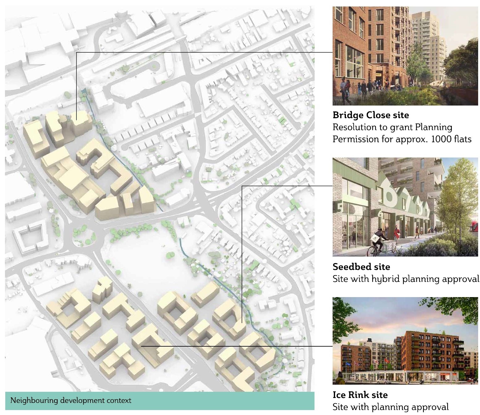 These proposals seek to minimise impacts on the surrounding community. By prioritising the publicly accessible green space, re-wilding the River Rom boundary and allocating space on site for a primary school, these proposals prioritise community integration.